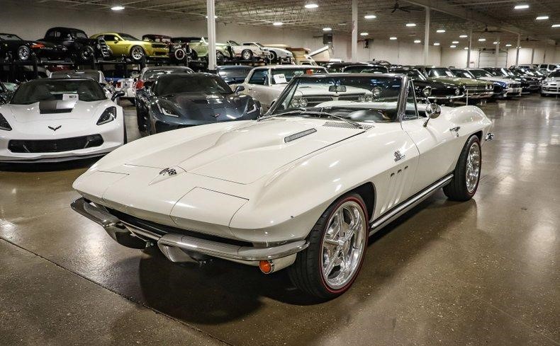 We are pleased to offer this 1965 Chevrolet Corvette Convertible, finished in white over a black interior with a black soft top. Under the hood is a 396 V8 built to an impressive 500 horsepower, paired with a 4-speed manual transmission for true big-block performance. Originally a small-block car, it has been upgraded with Borla exhaust, billet wheels, and performance enhancements while retaining classic C2 styling. The exterior and interior present cleanly, with crisp lines and timeless Corvette appeal. A powerful and well-sorted mid-year Corvette, ready to thrill on the road or turn heads at any show.